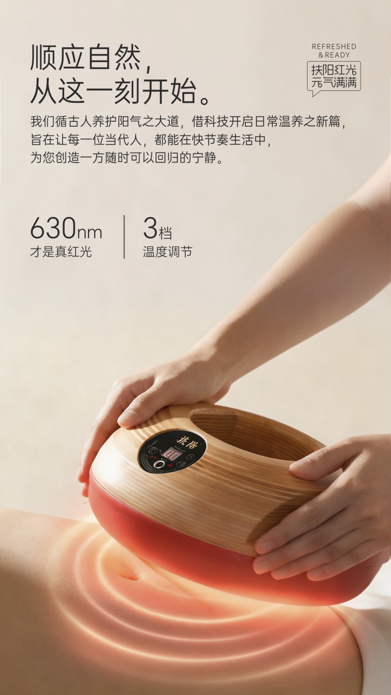 #握于手中,尽在掌握。开启一场沉浸式的红光SPA,无论是舒缓腹部还是推揉背部,居家养护变得如此随心、自由。