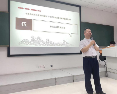 学校校企合作单位株洲扶阳医疗器械有限公司作为本次比赛的独家赞助单位,董事长胡木明表示:很荣幸可以参与本次比赛,希望同学们可以保持对中医药的热爱,不断地学习下去,祝愿同学们学业有成!