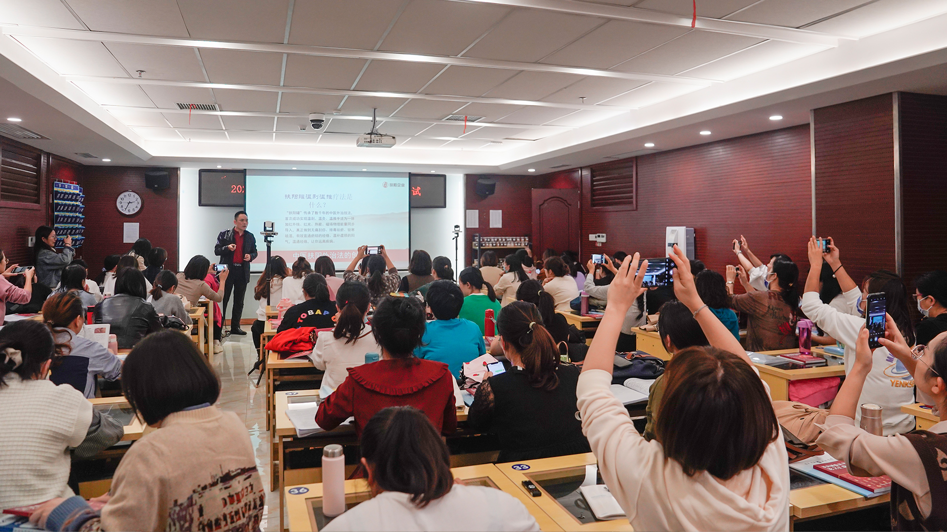 本次授课由扶阳罐温刮温推疗法推广办主任袁老师带领多位助教进行授课,凭借着丰富的专业知识和临床经验,袁老师深入浅出地为学员们讲解了扶阳罐在临床中的应用和专业技术手法。在一个小时讲课中,被扶阳罐疗法的独特优势所吸引,学员们深感兴趣,聚精会神做笔记 ,还不时提出问题相互互动。
